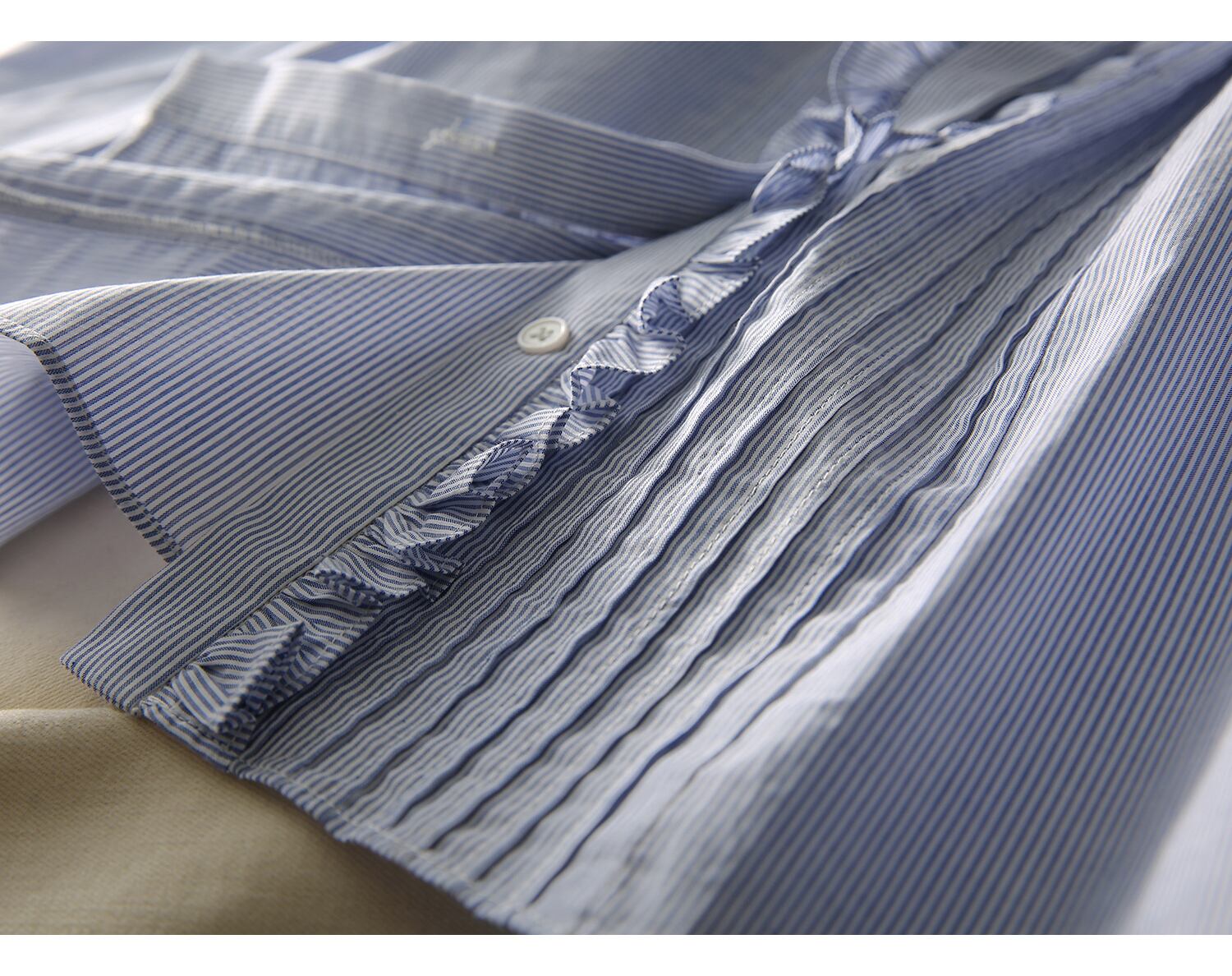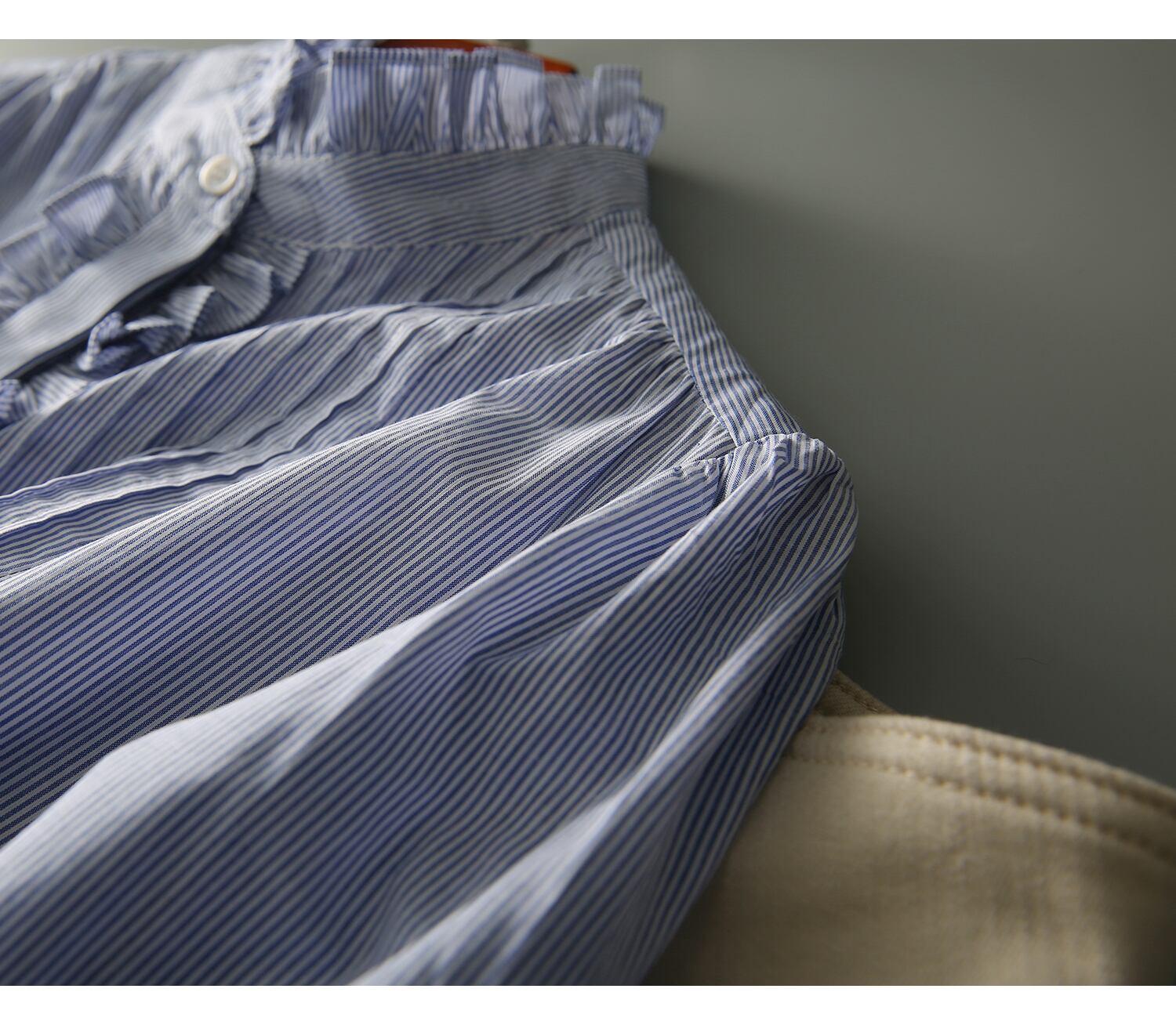 フレンチヴィンテージオルガンプリーツストライプシャツ女性春 トップス シャツ ミディアム丈 長袖 スタンドカラー ストレート プリーツ フリル 前開き 大人可愛い きれいめ シンプル カジュアル おしゃれ レトロ 大人女子 こなれ感 ラフ クール ストライプ 春 10代 20代 30代 レディース OL 通勤 学生 通学 デート お出かけ 女子会 お泊まり 休日 旅行 着回し 普段使い M L XL ブルー