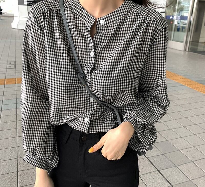 トップス ブラウス ミディアム丈 袖あり 長袖 パフスリーブ ラウンドネック ストレート かわいい 大人可愛い シンプル カジュアル おしゃれ 大人女子 こなれ感 キュート ガーリー 主役級 柄 チェック柄 春 秋 2022 10代 20代 30代 レディース デート お出かけ 女子会 休日 イベント 旅行 着回し 普段使い 韓国系 ファッション 楽ちん モテ 新作 定番 インスタ映え サイズ S M L XL 色展開 ブラック