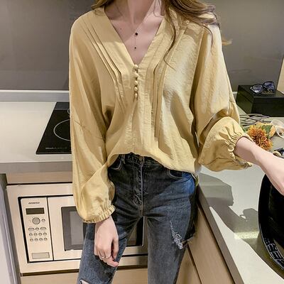 フロントの小さなくるみボタンが可愛らしい\Vネックブラウス。
