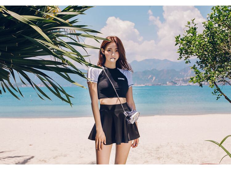 ハイウエストスカートスウィムウェアはシンプルでカジュアルな水着です。上は半袖で丈が短くへそ出しのデザインで、下はハイウエストのスカートになっています。スポーツウェアーとしても使える一着です。