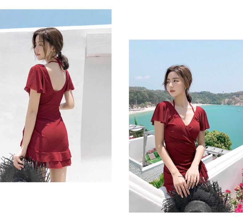 ビーチウェア 水着 ワンピース水着 ショートパンツ ワンピース ホルターネック ワイヤー パッド付き 二の腕カバー 半袖 スカート風 リボン フリル ウエストマーク バックシャン バックコンシャス 胸元 谷間 谷間魅せ 盛れる きれいめ セクシー シンプル おしゃれ レトロ 存在感 ガーリー 無地 10代 20代 30代 40代 レディース 女性用 ママ ミセス 女の子 夏 海 ビーチ プール リゾート 旅行 送料無料 2022 新作 M L XL 2XL 色展開 ブラック レッド イエロー