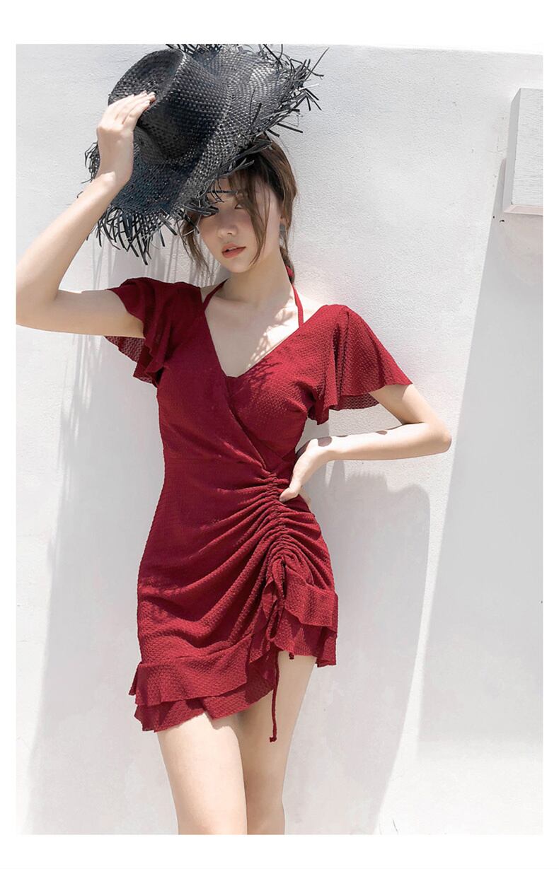 フリルワンピース水着は、ウエストから太ももにかけての絞りが印象的な水着です。カラーはブラック、レッド、イエローの3色展開です。セクシーでガーリーなデザインのワンピース水着です。