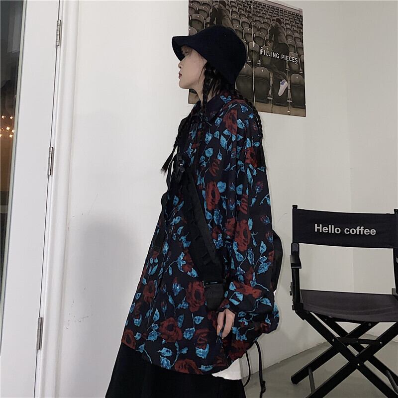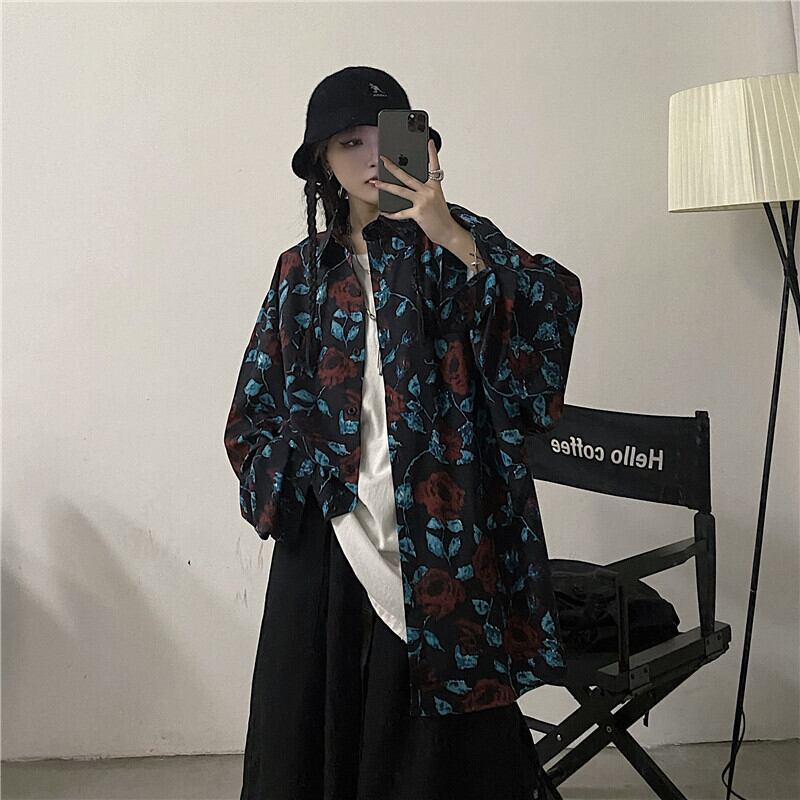 mapogoカジュアルフラワーブラウスは、ゆったりと着るブラウスです。裾が長いのでワンピースとしても活用できます。原宿ファッション、モード系、ヒップホップ、ストリートファッションのイメージです。