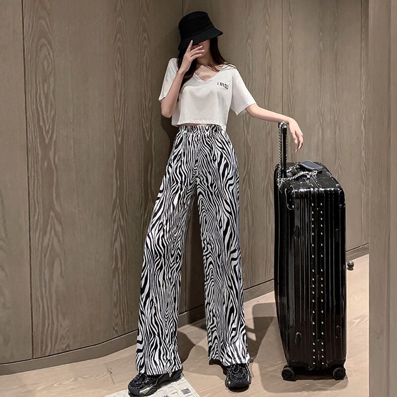 ゼブラ柄ワイドレッグパンツはカジュアルでクールなパンツです。ハイウエストで裾までまっすぐな幅広のパンツです。生地は薄手のアイスシルクなので夏にぴったりです。