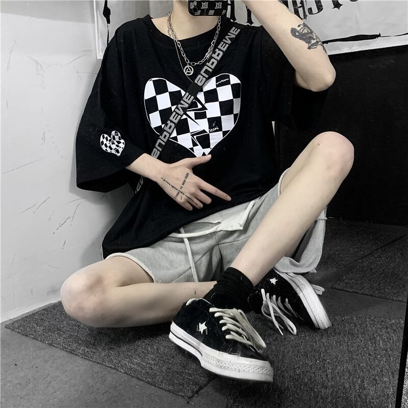インラブチェエク柄プリントTシャツは2022年夏の新作です。Tシャツの袖はハーフスリーブで、プリントのチェック柄のハートがアクセントとなっています。