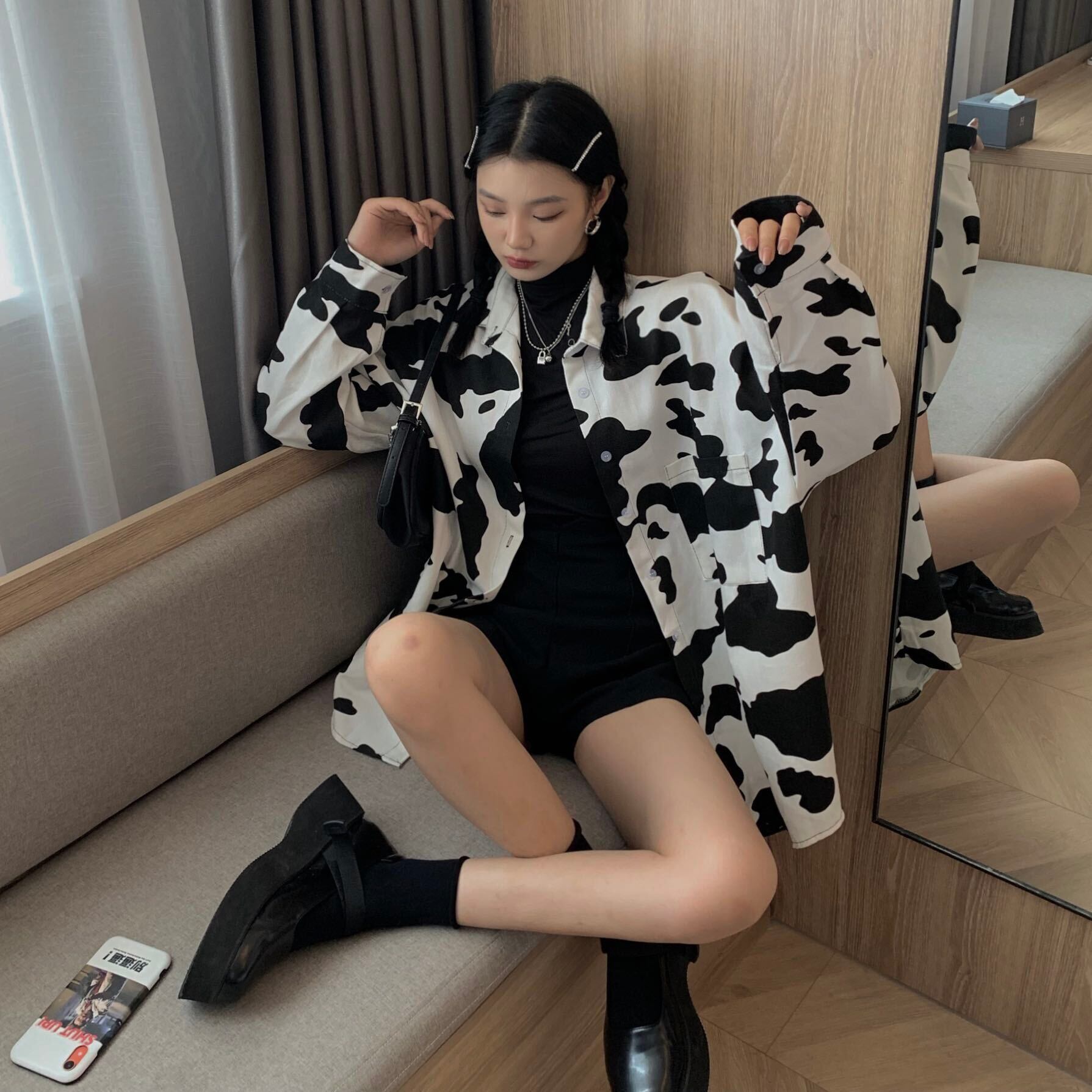 大きめルーズなカウ柄シャツ。