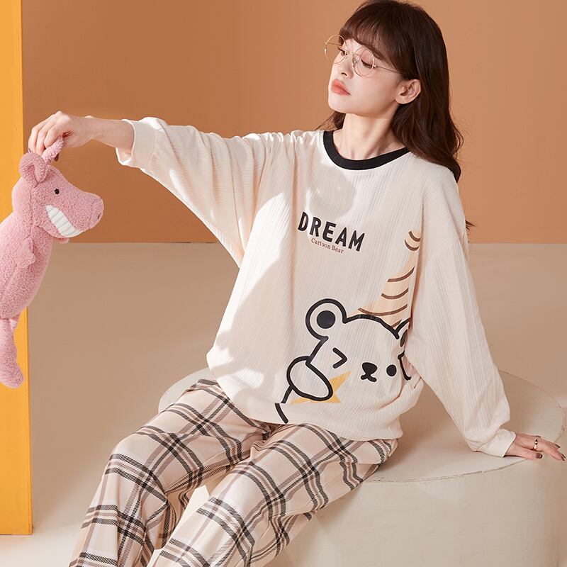 ルームウェア パジャマ プルオーバー 部屋着 寝巻き ナイトウェア 9分丈 アンクル丈 袖あり 長袖 Uネック ストレート くま くまちゃん 綿 上下セット かわいい シンプル カジュアル おしゃれ お洒落 ラフ キュート ルーズ 無地 チェック柄 プリント キャラクター 春 夏 10代 20代 30代 お泊まり 休日 運動 ヨガ 普段使い 楽ちん M L XL 2XL ホワイト ブルー ブラウン ピンク
