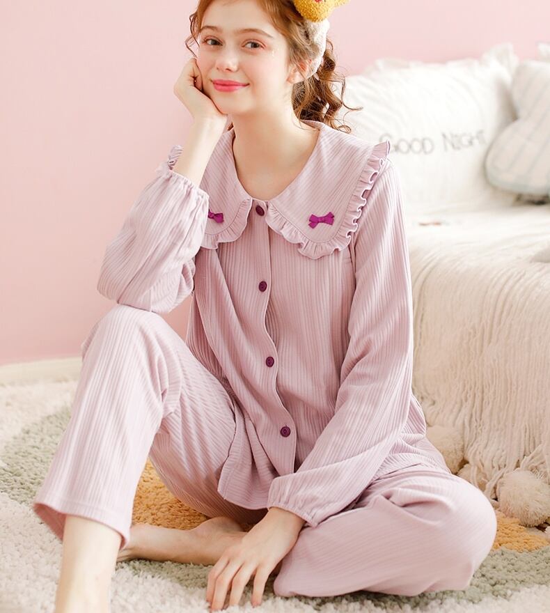 ルームウェア パジャマ 部屋着 寝巻き ナイトウェア 9分丈 アンクル丈 袖あり 長袖 Uネック 襟付き Aライン フリル リボン 前開き ウエストゴム 授乳口付き 授乳 綿 上下セット 2点セット かわいい 大人可愛い おしゃれ お洒落 大人女子 こなれ感 ラブリー キュート ガーリー ルーズ エレガント 主役級 存在感 無地 出産 休日 普段使い 楽ちん S M L XL ホワイト パープル ピンク