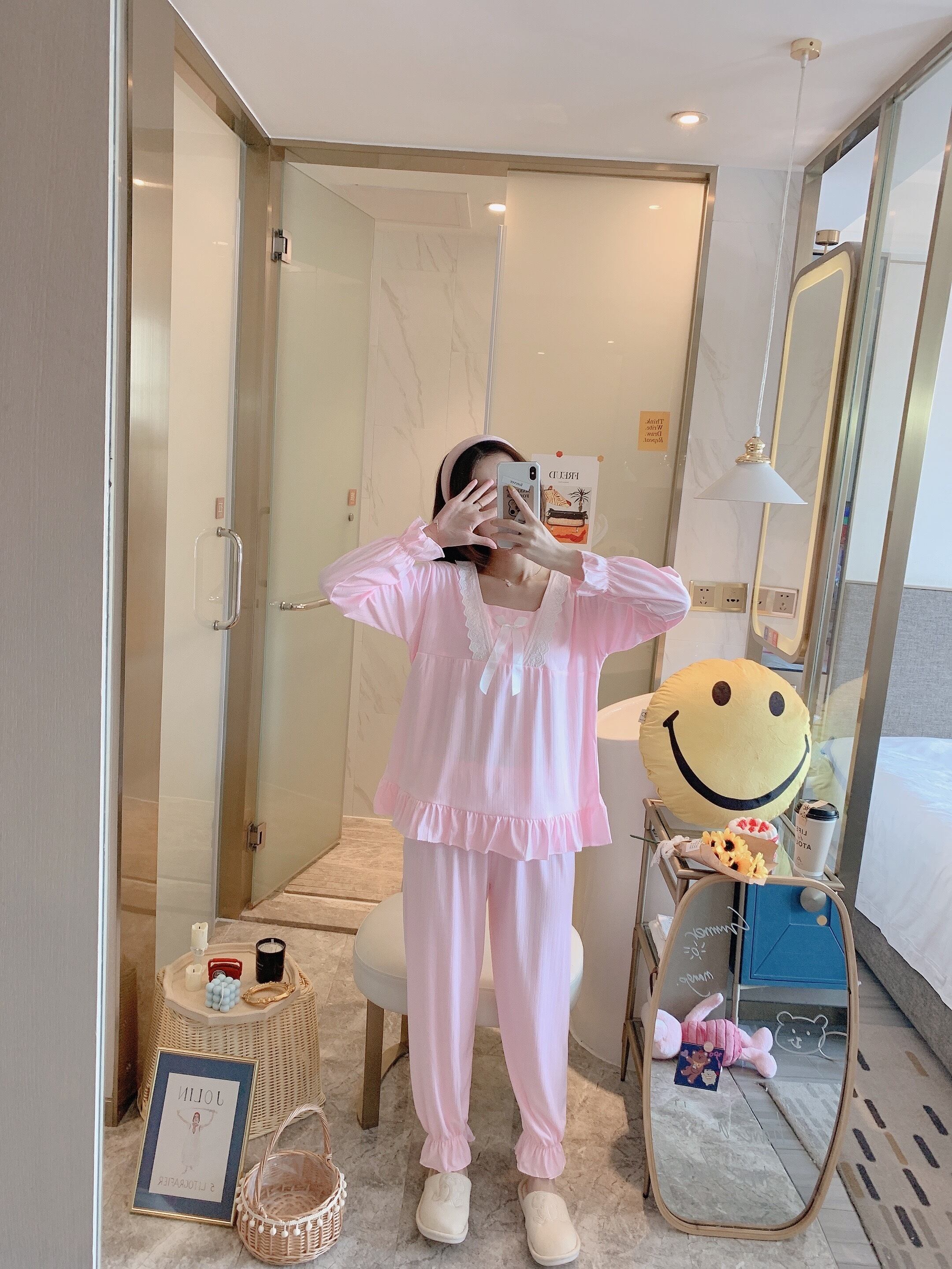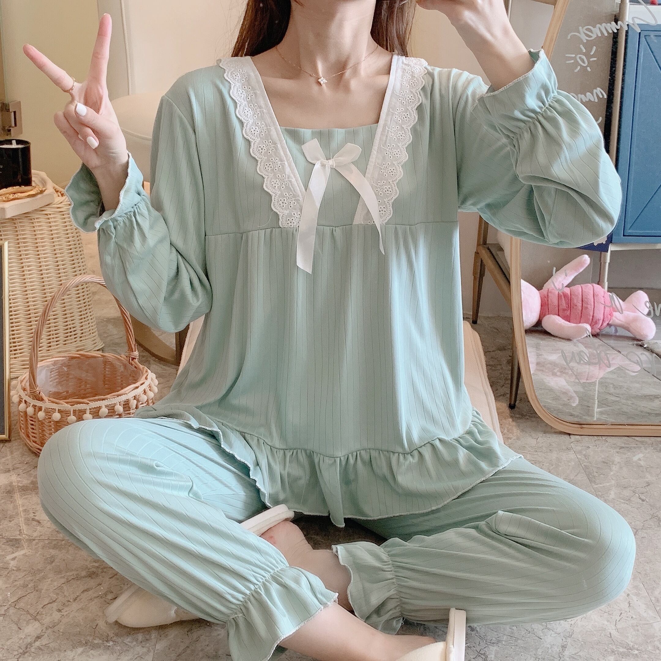 パジャマ 上下セット 2点セット 2ピース ツーピース パジャマセット トップス ボトムス 長袖パジャマ 長袖 ロングスリーブ ロングパンツ ロング丈 長ズボン レース襟 レース フリル シンプル 無地 裾フリル スクエアネック パステルカラー マカロンカラー かわいい 可愛い 甘め フェミニン ガーリー ピンク グリーン ライトピンク ブルーグレー M L XL 2XL 大きいサイズ プラスサイズ コットン コットンパジャマ 春 秋 10代 20代 お泊り 旅行 パジャマパーティー ウエストゴム