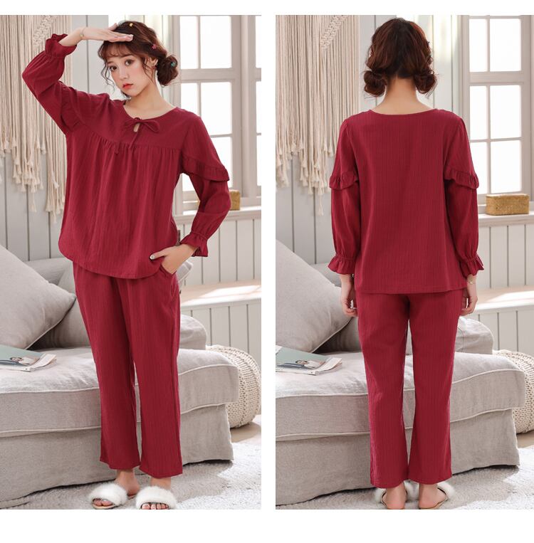 ルームウェア パジャマ ブラウス プルオーバー ズボン 部屋着 寝巻き ナイトウェア 9分丈 アンクル丈 袖あり 長袖 ボリューム袖 ラウンドネック ストレート フリル リボン 綿 薄手 上下セット おしゃれ 大人可愛い 大人女子 ラブリー キュート ガーリー 無地 春 秋 10代 20代 30代 40代 50代 60代 レディース 女子会 お泊まり 休日 L XL 2XL レッド ブルー ピンク グリーン ピンク