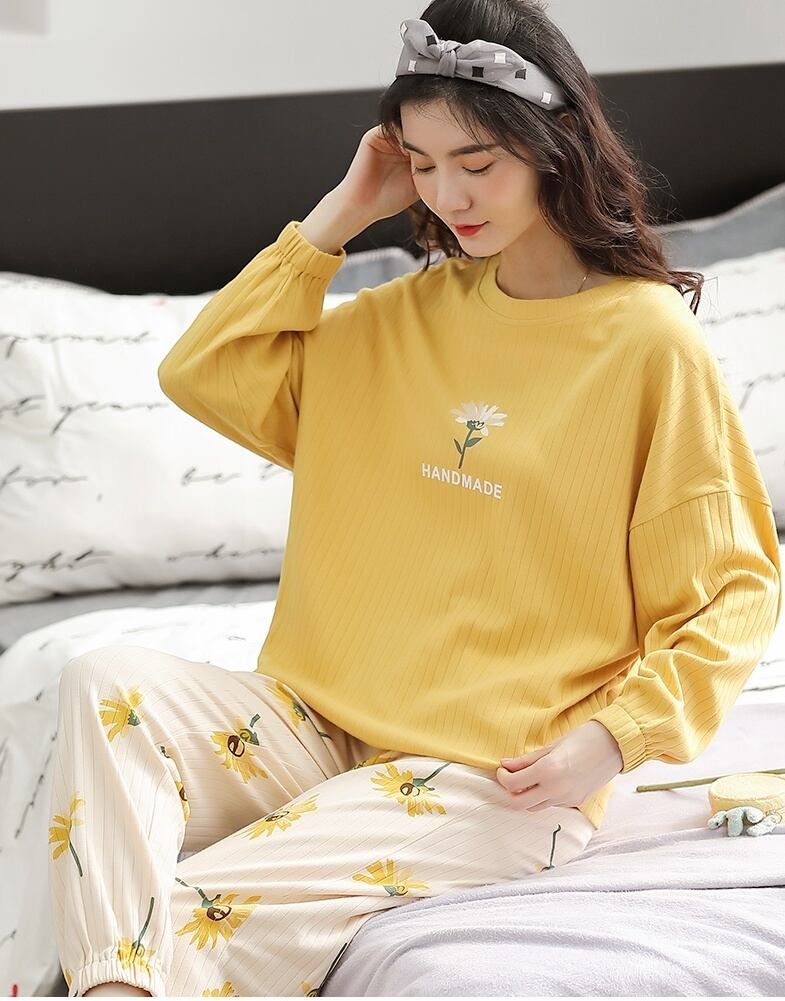 コットン素材の長袖、長ズボンのセットルームウェア。