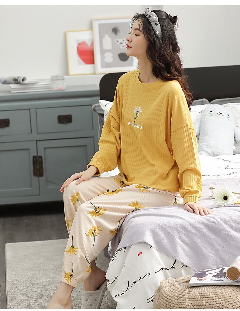ルームウェア パジャマ スウェット 部屋着 寝巻き 9分丈 アンクル丈 袖あり 長袖 Uネック 襟なし リブ ウエストゴム 綿 上下セット 2点セット かわいい 大人可愛い シンプル カジュアル おしゃれ お洒落 ラフ ラブリー キュート フラワー プリント フルーツ柄 秋 10代 20代 30代 お泊まり 休日 普段使い 楽ちん M L XL 2XL オフホワイト イエロー ピンク