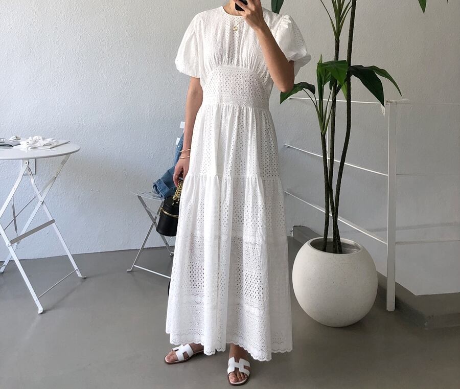ワンピース ワンピドレス 9分丈 アンクル丈 袖あり 半袖 パフスリーブ Uネック 襟なし フレア 切り替えデザイン レース ハイウエスト 透け感 ジャガード かわいい きれいめ 大人 上品 大人可愛い 大人女子 こなれ感 ラブリー ガーリー エレガント 主役級 存在感 抜け感 無地 春 20代 30代 40代 50代 OL デート お出かけ 女子会 休日 イベント ファッション コーデ スタイル モテ M ホワイト グリーン ブラウン