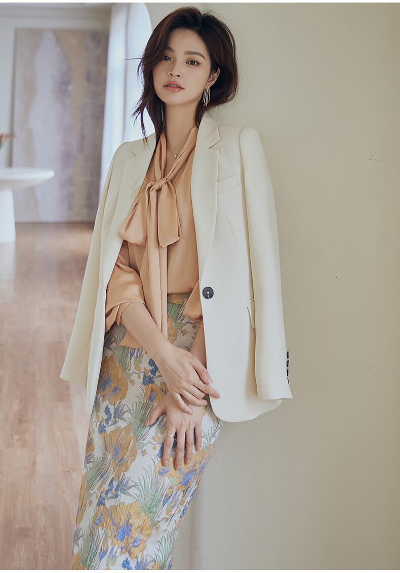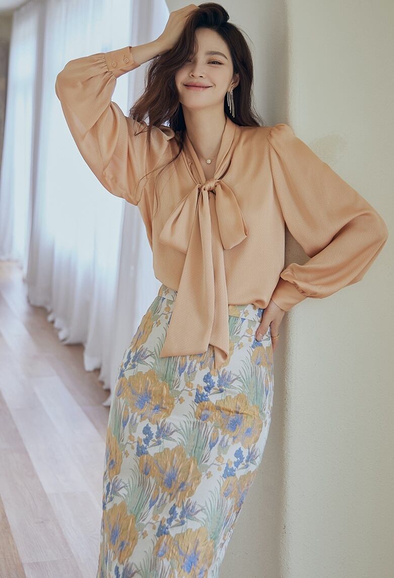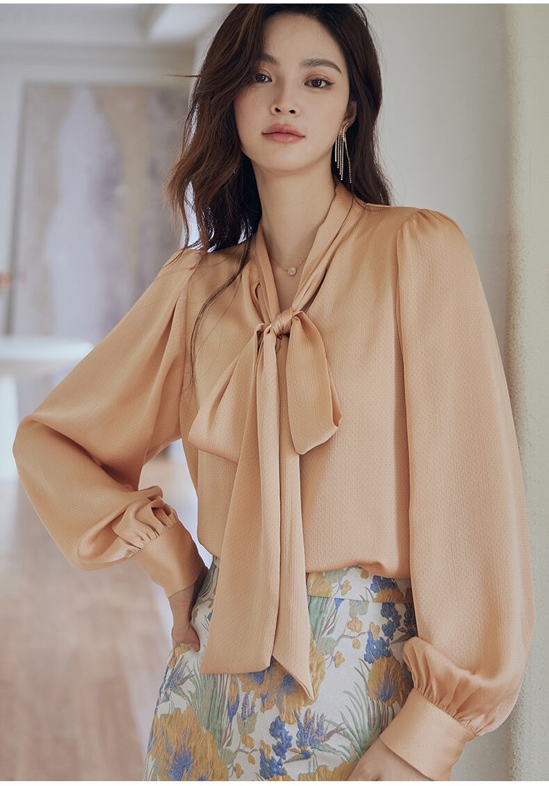 上品なリボンタイのついたブラウス。