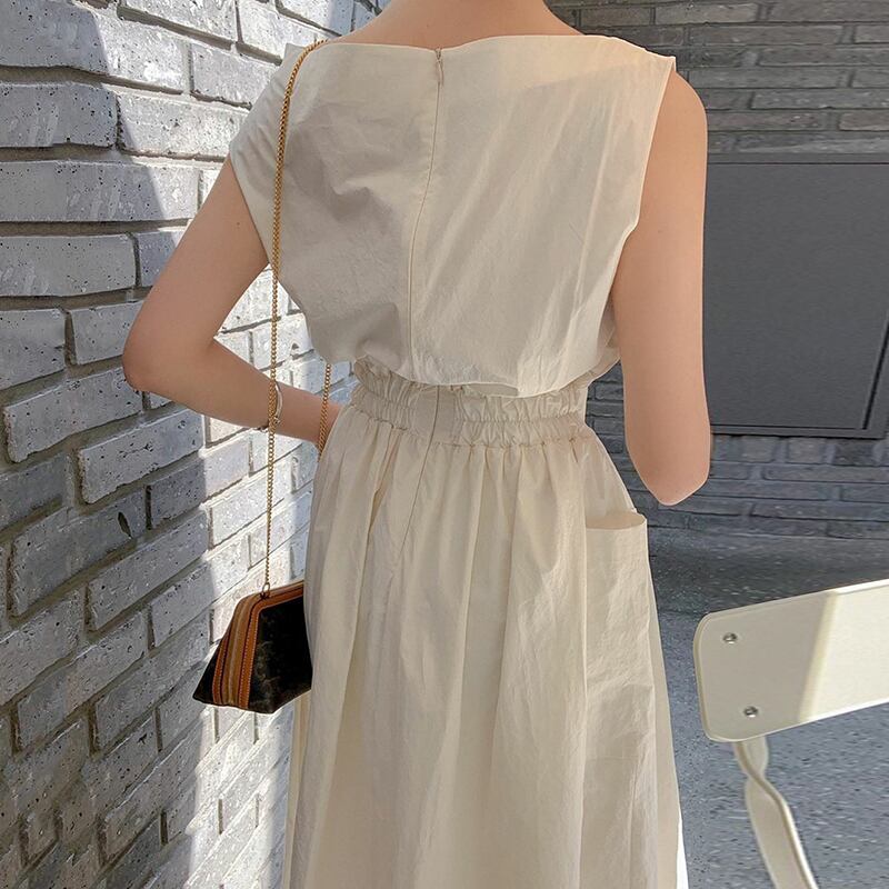 ワンピース フレアワンピース ワンピドレス 7分丈 袖なし ドロップショルダー ワンショルダー ワンショル 襟なし フレア ウエストマーク ファスナー ハイウエスト かわいい 大人可愛い きれいめ シンプル 大人 上品 おしゃれ お洒落 大人女子 こなれ感 無地 春 夏 30代 40代 レディース OL デート 休日 普段使い ファッション コーデ スタイル モテ ワンサイズ 白 ホワイト
