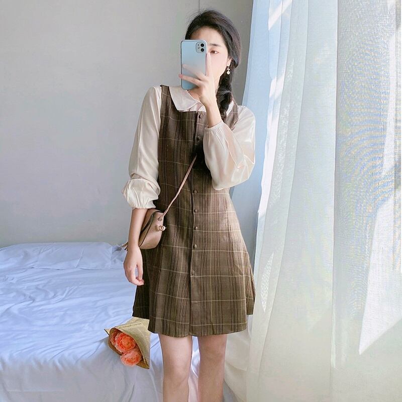 ナチュラルなブラウスとチェック柄のショート丈ワンピースのセットです。