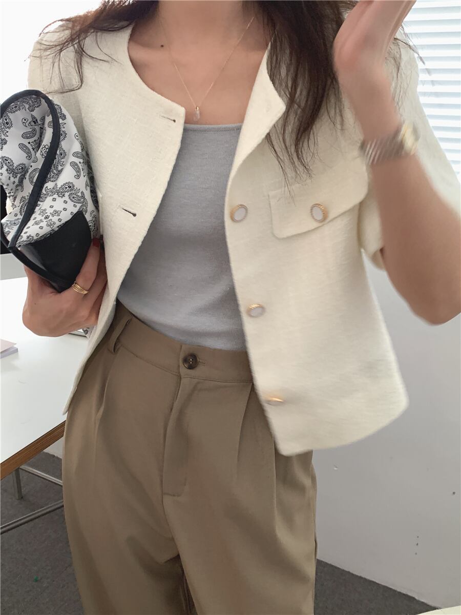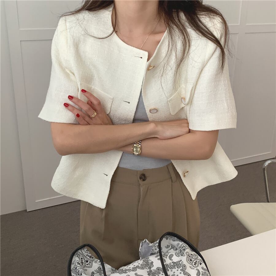 トップス アウター ジャケット 上着 ショート ショート丈 袖あり 半袖 ラウンドネック 襟なし ワイド ポケット 前開き ボタン 大人可愛い きれいめ 大人 上品 おしゃれ お洒落 大人女子 こなれ感 ラブリー ルーズ モード系 モダン 存在感 ナチュラル 無地 春 秋 20代 30代 40代 レディース OL 通勤 デート お出かけ 重ね着 ファッション コーデ スタイル モテ ワンサイズ 白 ホワイト