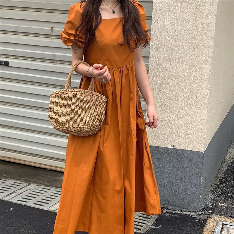 ワンピース ワンピドレス 9分丈 アンクル丈 袖あり 半袖 ボリューム袖 パフスリーブ スクエアネック フレア Aライン 切り替えデザイン ウエストマーク バックリボン バックスリット バックシャン ハイウエスト かわいい 大人可愛い シンプル カジュアル おしゃれ お洒落 大人可愛い 大人女子 こなれ感 ラブリー ガーリー 主役級 無地 春 夏 秋 10代 20代 30代 40代 レディース デート お出かけ リゾート 旅行 ファッション コーデ モテ M L XL オレンジ