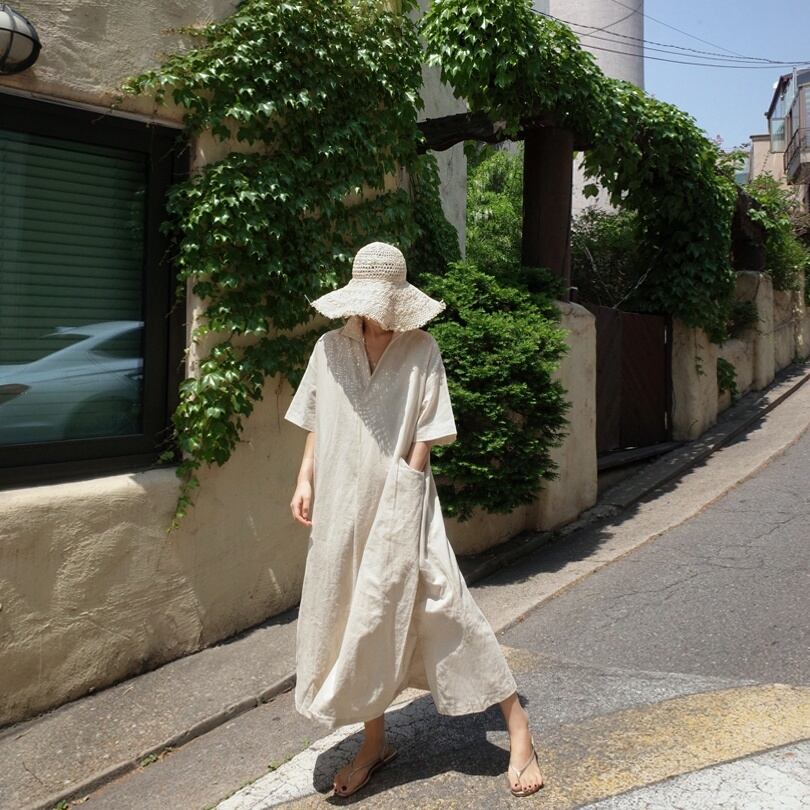 コットン、リネンのナチュラルな雰囲気のワンピース。