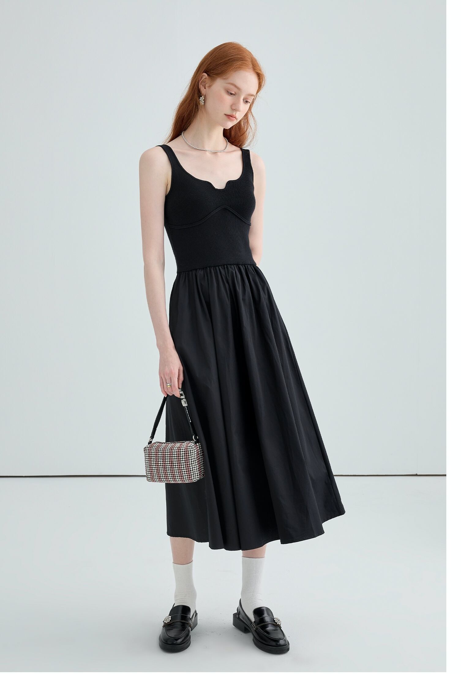 ミディアム丈のブラックワンピース。