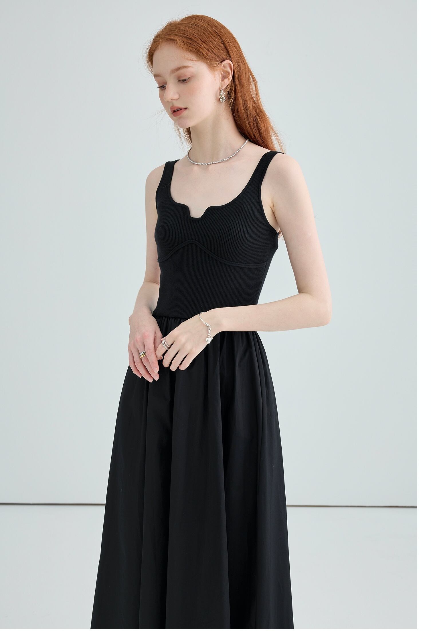 ワンピース ロングスカート ワンピドレス 膝下 7分丈 ミディアム丈 スクエアネック 襟なし フレア スリム Aライン ドッキング ウエストマーク 切り替えデザイン ハイウエスト リブ 大人可愛い シンプル 大人 おしゃれ お洒落 大人女子 クール エレガント モダン 主役級 存在感 フォーマル 上質 シック 無地 夏 秋 20代 30代 40代 レディース デート お出かけ 着回し モテ S M 黒 ブラック