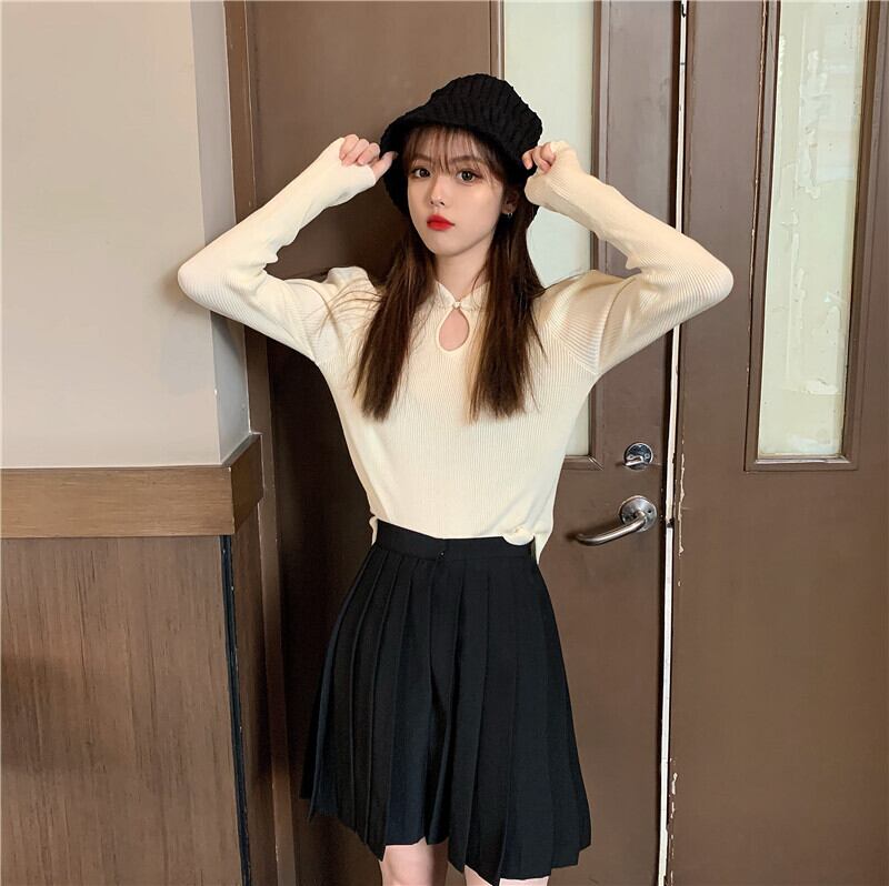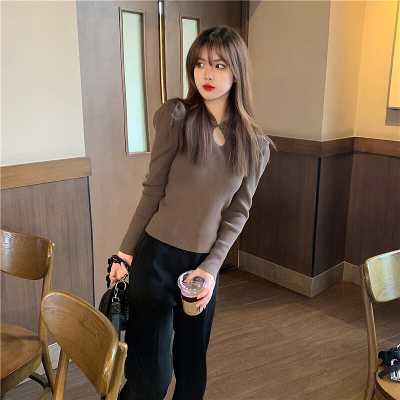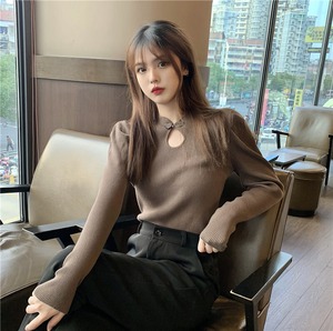 トップス ニットソー 袖あり 長袖 パフスリーブ チャイナネック チャイナ スリム タイト 細身 ストレート Iライン ニット かわいい 大人可愛い シンプル 大人 上品 お洒落 アジアン 大人女子 こなれ感 ラブリー キュート ガーリー セクシー エレガント 無地 秋 冬 10代 20代 30代 40代 50代 レディース OL デート 休日 着回し 普段使い 重ね着 ファッション コーデ スタイル S M L ホワイト ブラック ブラウン
