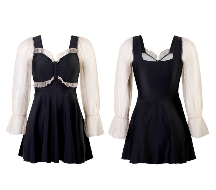 シフォン袖と長袖ワンピーススタイルで体型カバーも叶うスイムウェア。