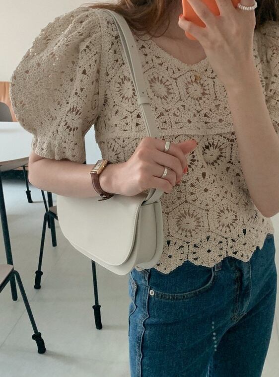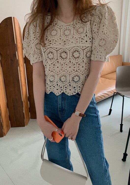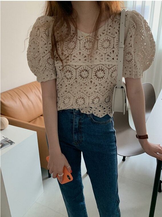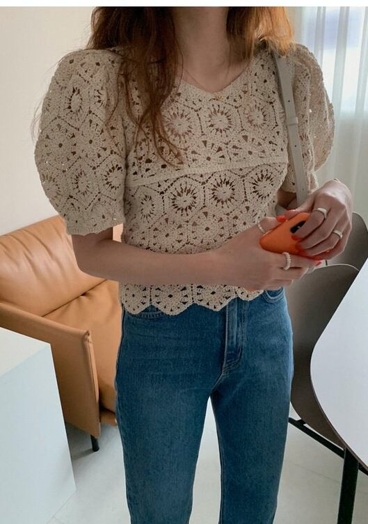 トップス ニットソー ショート ショート丈 袖あり 半袖 ボリューム袖 パフスリーブ ラウンドネック 襟なし クロシェ 編み込み 鍵針編み かぎ針編み 透け感 ウール きれいめ 大人 上品 おしゃれ お洒落 大人可愛い 大人女子 こなれ感 ガーリー ルーズ エレガント 抜け感 ナチュラル 花柄 フラワー 春 秋 20代 30代 40代 レディース お出かけ ワンサイズ 白 ホワイト ベージュ