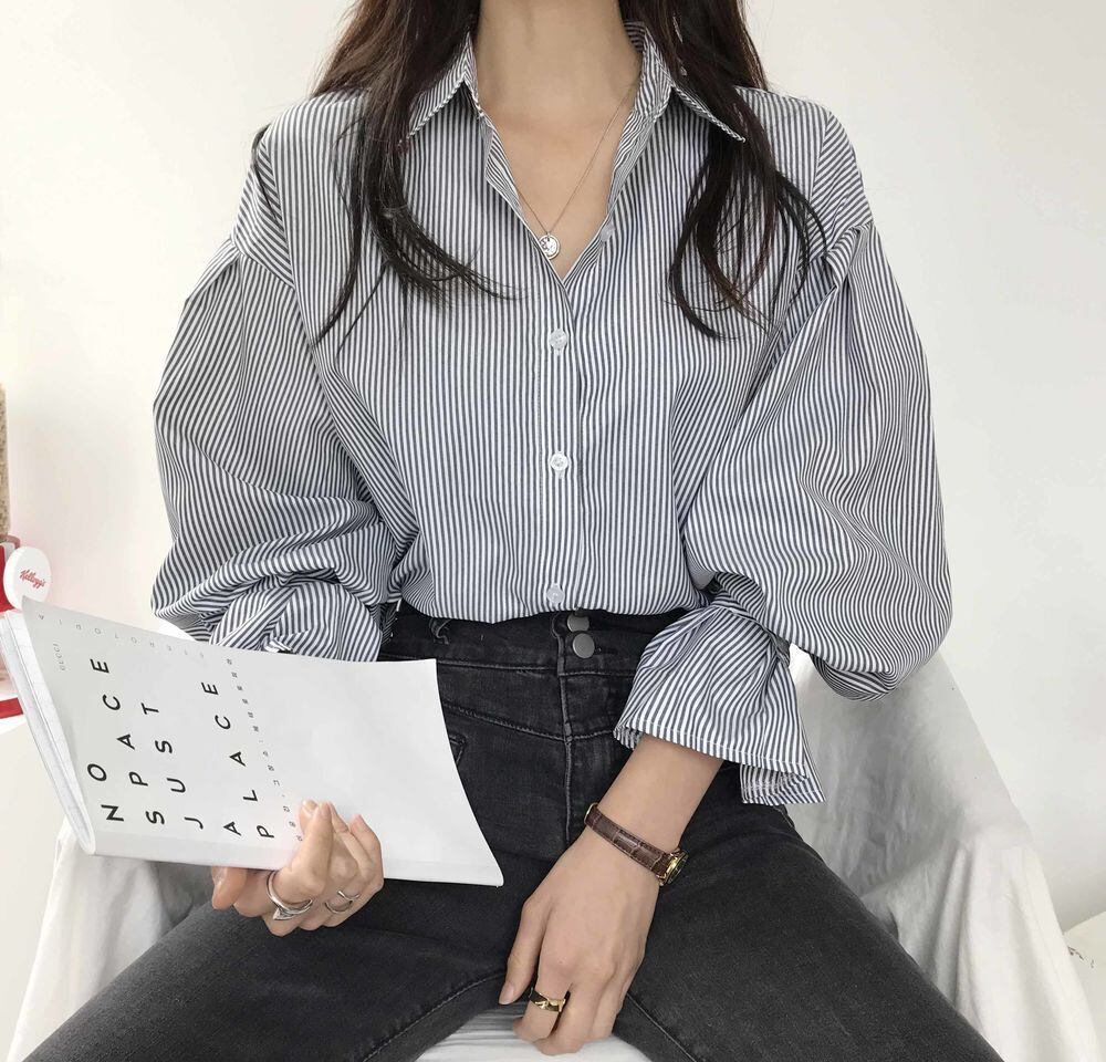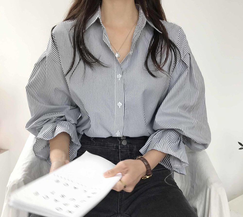シャツ ブラウス トップス 長袖 Vネック パフスリーブ ストライプ ボーダー 襟付き ボリューム袖 フレア ブラック ブルー シンプル 高見え エレガント 可愛い キュート きれいめ フリーサイズ ワンサイズ 10代 20代 30代 40代 通勤 通学 デート 女子会 ランチ カフェ お出かけ 休日 ショッピング 会社 学校 大人可愛い 大人っぽ プチプラ 送料無料 着痩せ スタイル コーデ ファッション 韓国系 オルチャン インスタ映え 普段使い レディース 女性用 春 秋 スタイルアップ こなれ感