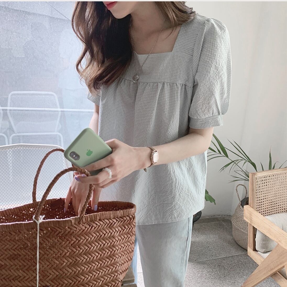 トップス ブラウス 袖あり 半袖 パフスリーブ スクエアネック 襟なし ワイド 切り替えデザイン かわいい 大人可愛い シンプル カジュアル 大人 大人女子 こなれ感 ラブリー キュート ガーリー ナチュラル 柄 格子柄 20代 30代 40代 50代 レディース 普段使い コーデ モテ S M L XL 黒 ブラック 青 ブルー