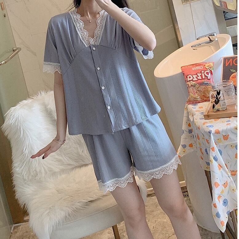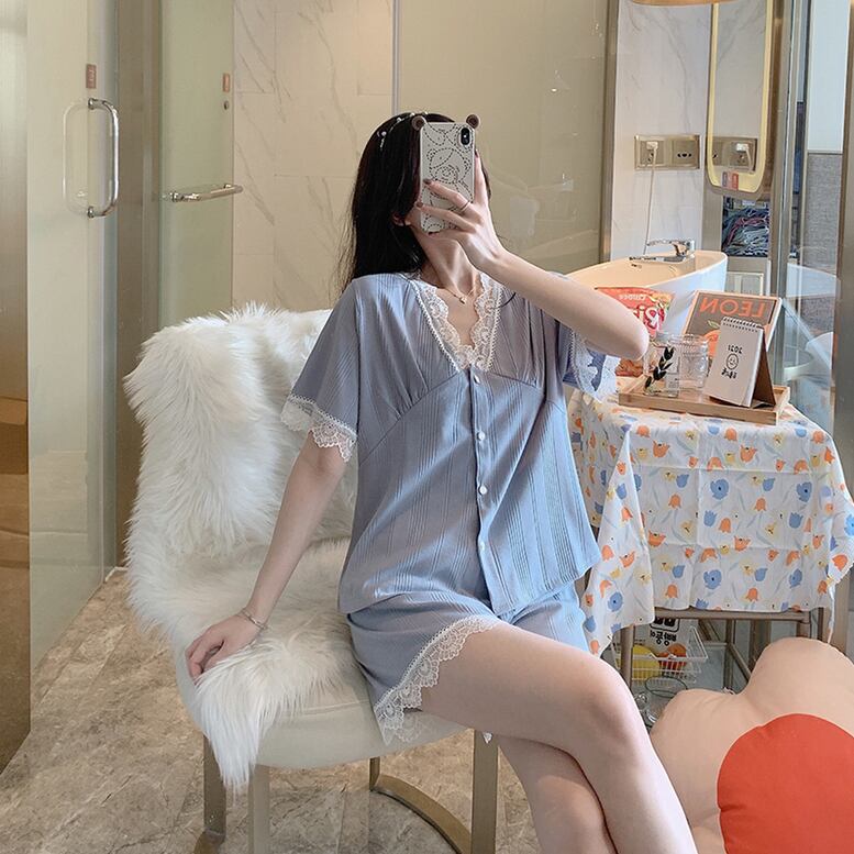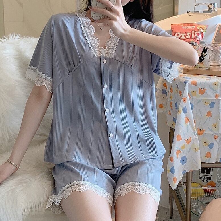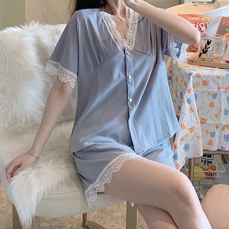 ルームウェア パジャマ レース Vネック リブ カットソー 半袖 ショートパンツ 袖口レース 裾レース シャツ パンツ ボタン ナイトウェア 部屋着 レディース 水色 ブルー 大人可愛い きれいめ 上品 エレガント ガーリー ルーズ キュート 春 夏 秋 冬 オールシーズン お出かけ パーティー イベント 女子会 休日 旅行 リゾート お泊まり モテ 普段使い 定番 トレンド ゆったり インスタ映え ライトブルー アースカラー ニュアンスカラー おしゃれ かわいい 着回し 重ね着 プレゼント ギフト