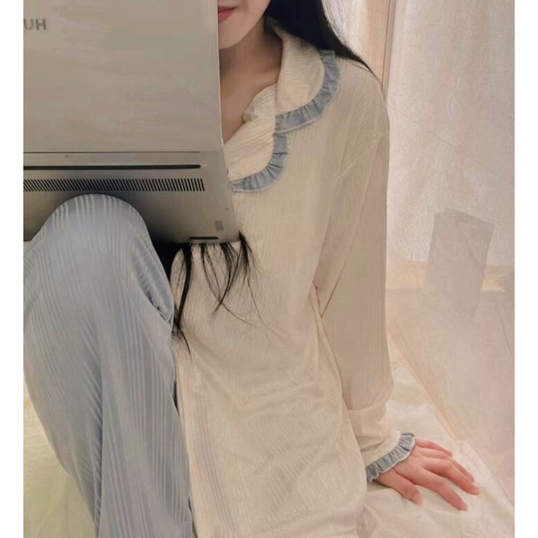 パジャマ ルームウェア ナイトウェア セットアップ リブカットソー オープンカラーシャツ ロングパンツ フリル付き バイカラー 2点セット 上下セット ツーピース レディース 白 水色 オフホワイト ブルー 大人可愛い きれいめ 上品 エレガント ガーリー ルーズ キュート おしゃれ 春 夏 秋 冬 オールシーズン 出かけ パーティー イベント 女子会 休日 旅行 リゾート お泊まり 体型カバー モテ 普段使い 定番 トレンド ゆったり インスタ映え