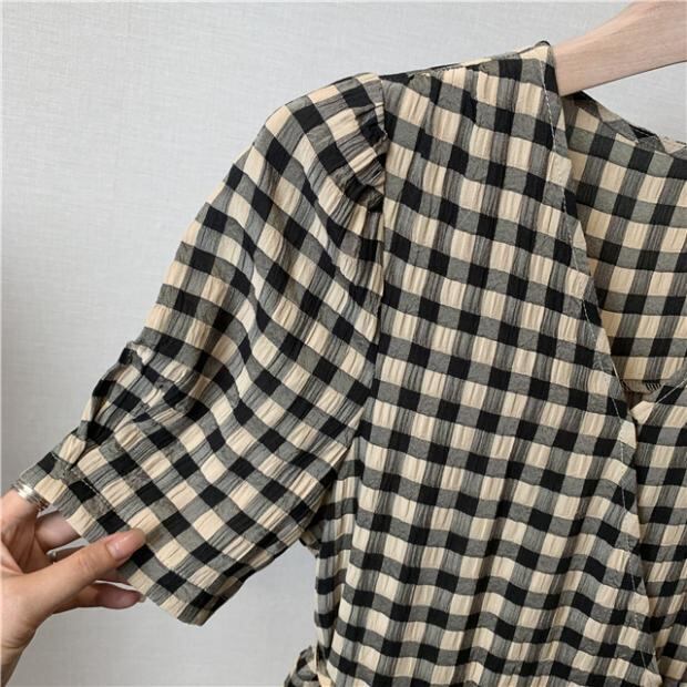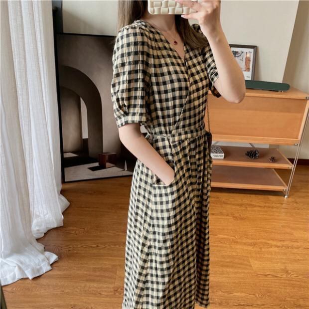 ワンピース ミモレ丈ワンピース ミモレ丈 半袖ワンピース 半袖 Vネック チェック柄 チェック パフスリーブ ハイウエスト プルオーバー レトロ フレンチ レトロフレンチ M L 20代 30代 40代 上品 ガーリー 大人 大人かわいい 大人可愛い フェミニン 大人カジュアル カジュアル お出かけ デート デイリー 普段使い 着回し 主役級 クラシカル エレガント ママコーデ 清楚 春 夏 秋 韓国ファッション 韓国 スタイルアップ 美シルエット 体型カバー 着痩せ 細見え Aライン Aラインワンピース