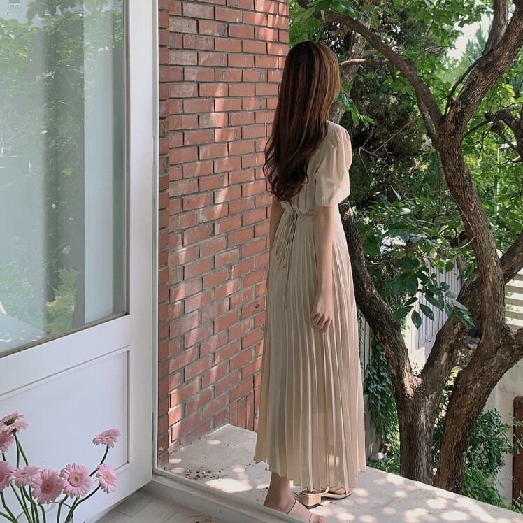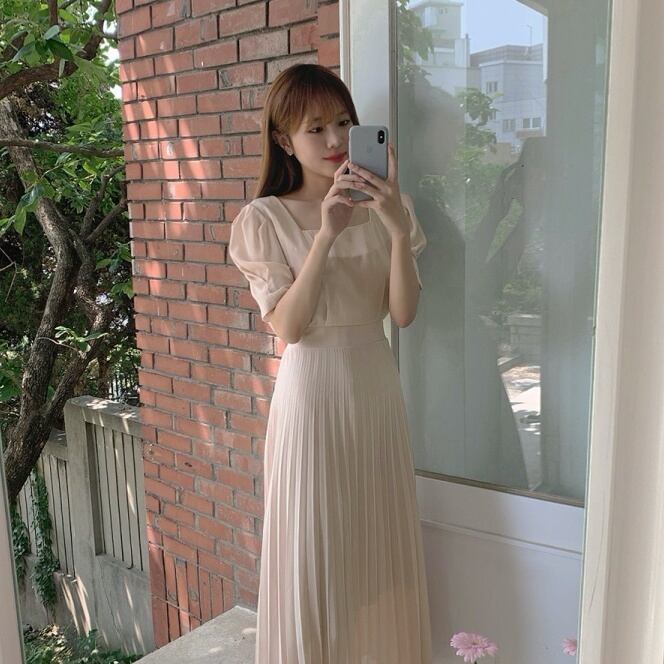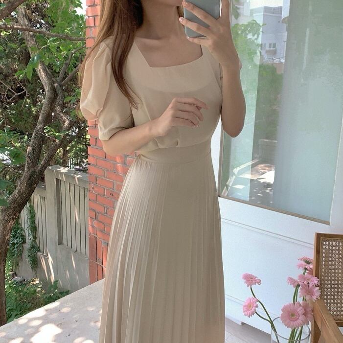ワンピース プリーツスカート ワンピドレス ロング ロング丈 袖あり パフスリーブ スクエアネック 襟なし スリム タイト Iライン 切り替えデザイン ドッキング プリーツ ウエストマーク ハイウエスト 薄手 かわいい 大人可愛い きれいめ 大人 上品 おしゃれ お洒落 レトロ 大人女子 こなれ感 ガーリー エレガント とろみ感 抜け感 ナチュラル 無地 春 夏 20代 30代 40代 レディース デート お出かけ 韓国 韓国系 ファッション コーデ モテ S M L XL ベージュ