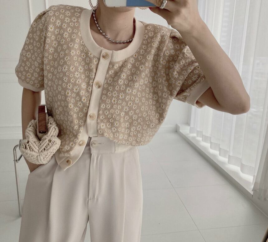 トップス カーディガン ショート 袖あり 半袖 パフスリーブ Uネック ラウンドネック 襟なし 前開き ボタン かわいい 大人可愛い 大人 おしゃれ お洒落 レトロ 大人女子 こなれ感 ガーリー ルーズ エレガント ナチュラル シック 柄 花柄 小花柄 フラワー 春 20代 30代 40代 デート お出かけ 着回し 重ね着 韓国 韓国系 オルチャン ファッション スタイル モテ ワンサイズ ブラック ベージュ 水色