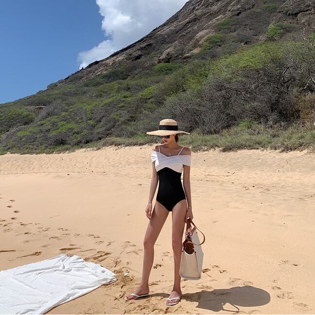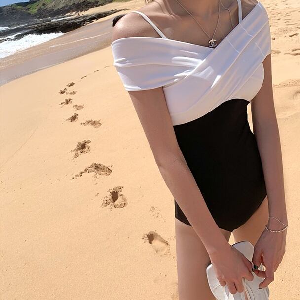 水着 スイムウェア ワンピース オフショルダー オフショル クロス 体系カバー 二の腕カバー 切り替えデザイン ギャザー 大人可愛い きれいめ シンプル 大人 大人っぽい おしゃれ お洒落 女っぽ クール モード系 スタイリッシュ モダン かっこいい 無地 40代 夏 海 ビーチ プール リゾート スタイル M L XL モノトーン