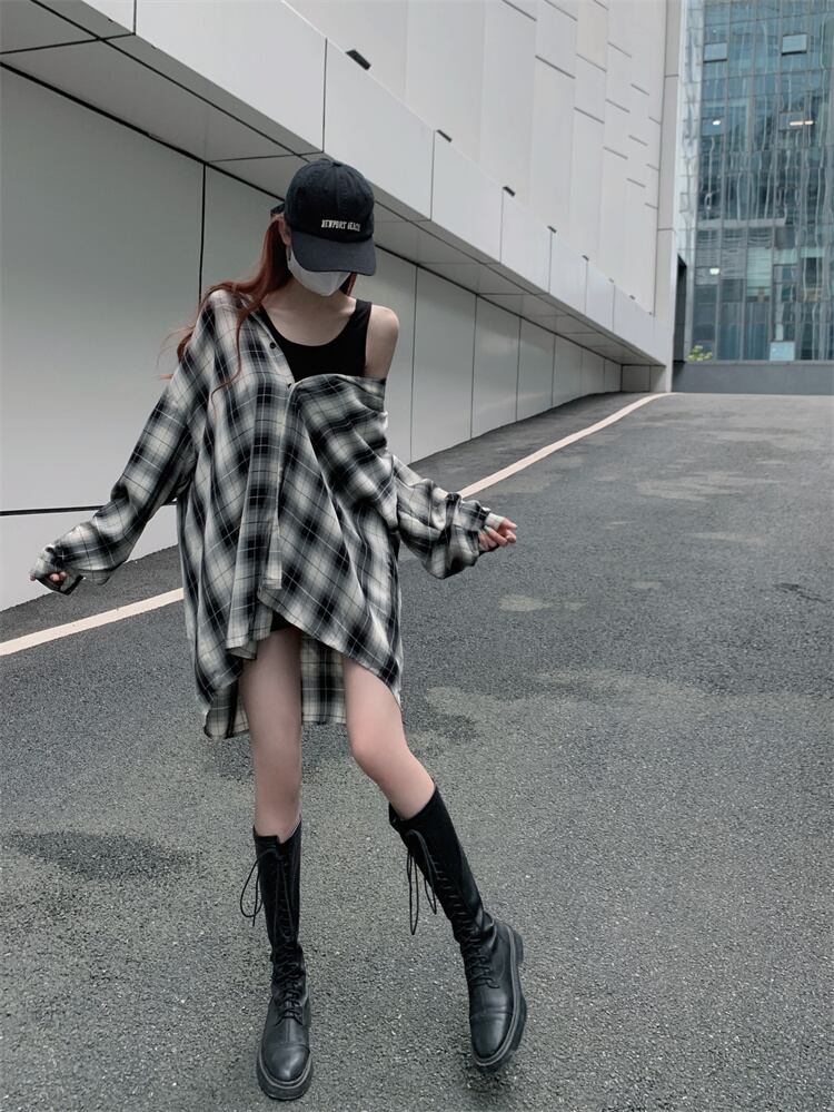 リブタンクトップのミニワンピとルーズなチェック柄シャツのセット。