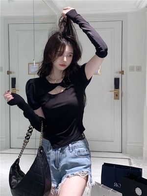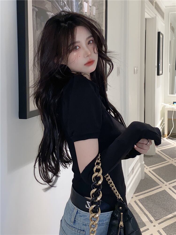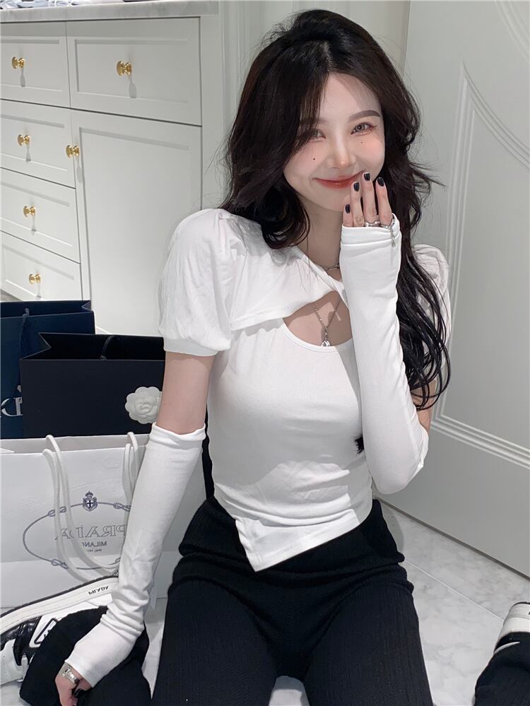 トップス シャツ ショート ショート丈 アームカバー 袖あり 半袖 Uネック スリム タイト 細身 スリット 大人可愛い シンプル カジュアル 大人 おしゃれ お洒落 かっこいい 大人女子 こなれ感 個性的 クール モード系 セクシー 主役級 存在感 とろみ感 抜け感 ナチュラル シック 無地 夏 10代 20代 30代 レディース デート お出かけ 重ね着 オルチャン ファッション スタイル モテ 穴あき S M L ホワイト ブラック