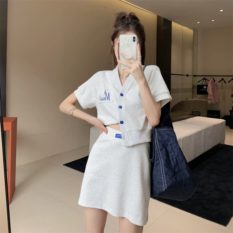 セットアップ カットソー スウェット ミニスカート ミニ ミニ丈 ショート ショート丈 袖あり 半袖 Vネック スリム タイト ハイウエスト 前開き 上下セット 2点セット ツーピース かわいい シンプル カジュアル お洒落 かっこいい こなれ感 スポーティー ラブリー ガーリー 無地 春 夏 10代 20代 30代 レディース お出かけ 休日 イベント 着回し ファッション コーデ スタイル S M L 灰色 グレー