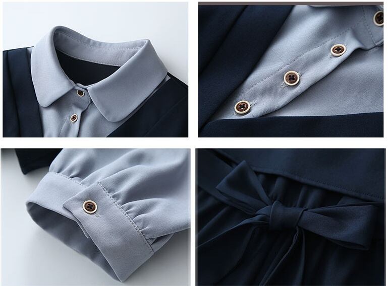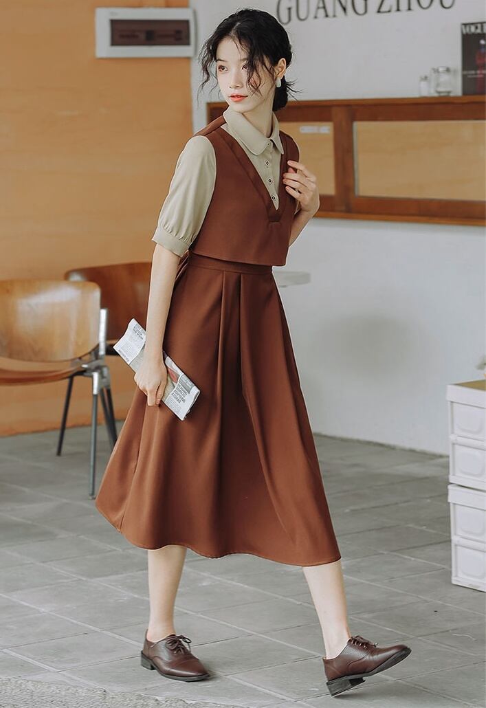 ブラウスとワンピースがドッキング した制服風ワンピース。
