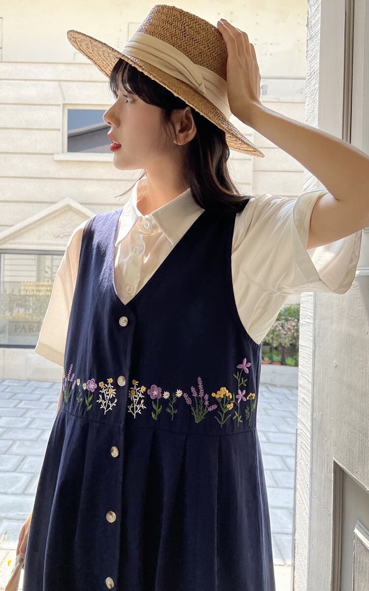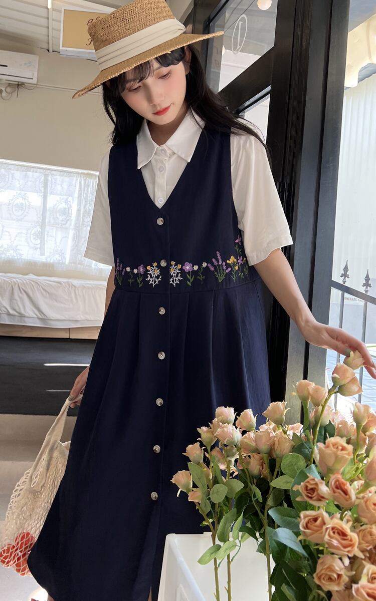 セットアップ 2点セット 2ピース ミモレ丈 ミモレ丈ワンピース ジャンパースカート スカート 刺繍 花柄 フラワー刺? フローラル Vネック フロントボタン 半袖シャツ 半袖 シャツ シンプル 無地 オフホワイト ネイビー グリーン XS S M L XL 春 夏 お出かけ デート デイリー 普段使い 着回し レイヤード 10代 20代 ガーリー キュート ナチュラル 素朴 清楚 上品 フェミニン 甘め ハイウエスト Aライン Aラインスカート レディース 韓国 韓国コーデ 韓国スタイル