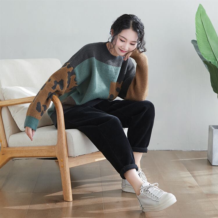 トップス セーター プルオーバー 袖あり 長袖 ラウンドネック 襟なし ワイド 切り替えデザイン ドッキング ニット 大人可愛い カジュアル 大人 おしゃれ お洒落 かっこいい レトロ こなれ感 ラフ メンズライク ルーズ 個性的 クール 存在感 柄 ヒョウ柄 レオパード 冬 10代 20代 30代 40代 レディース お出かけ 休日 普段使い 韓国 韓国系 オルチャン ファッション コーデ 暖かい 体系カバー 大きい ゆったり ゆる ワンサイズ ワンカラー