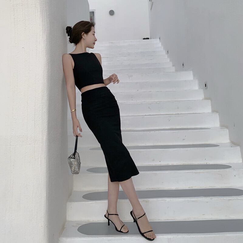セットアップ 2点セット 2ピース クロップトップス ショート丈トップス タイトスカート ミドル丈 ひざ丈 ミドル丈スカート ひざ丈スカート バックスリット シンプル 無地 ホワイト ブラック 白 黒 S M L お出かけ デート リゾート ビーチ 旅行 コンサバ クロップド丈 スタイルアップ 美スタイル ノースリーブ タンクトップ 袖なし タイト スリム 大人 こなれ感 20代 30代 エレガント ツーピース 韓国スタイル 韓国ファッション 韓国スタイル 韓国 夏 上品 レディース へそ出し へそ見せ