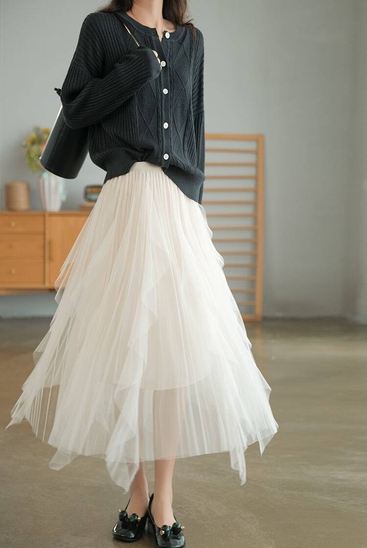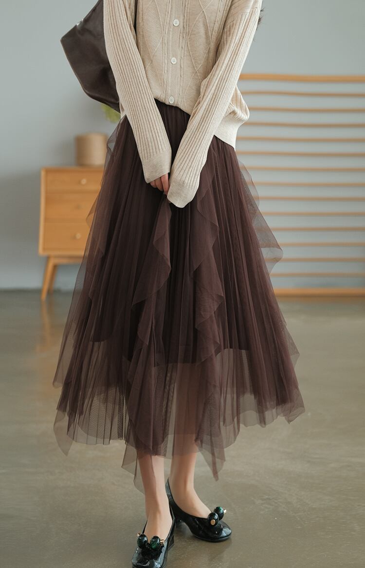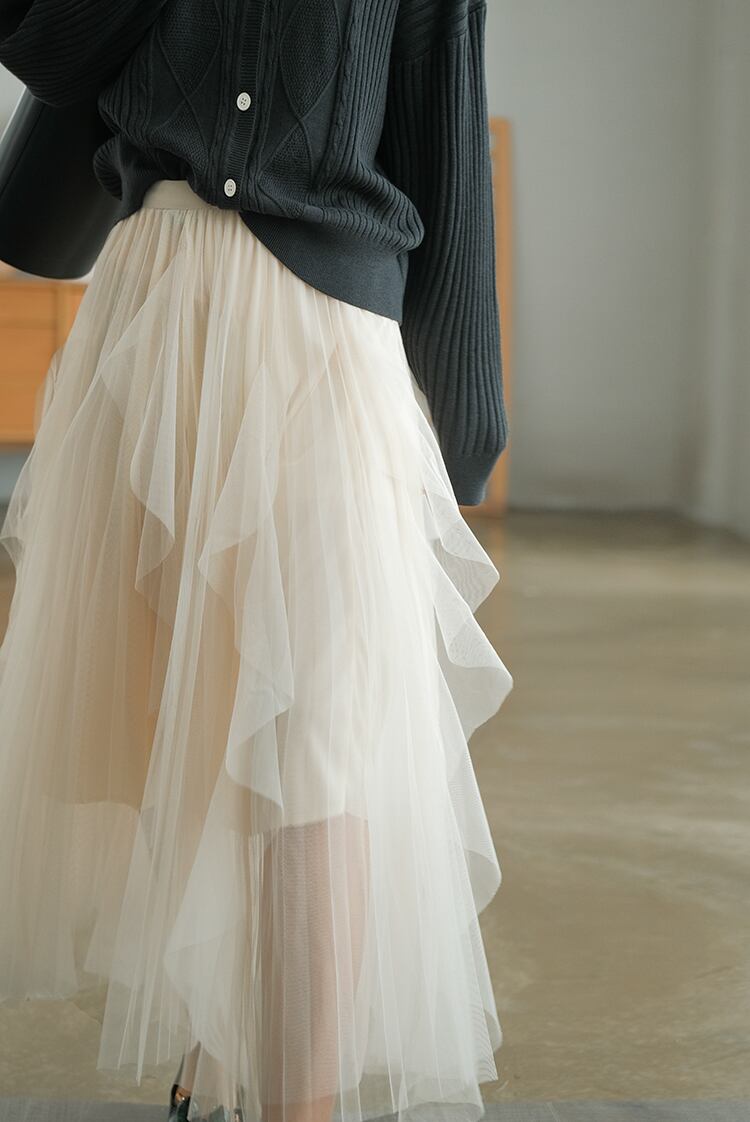 スカート ロングスカート チュールスカート ロング ロング丈 フレア Aライン チュール フリル ウエストゴム シック かわいい 大人可愛い 大人 上品 おしゃれ レトロ こなれ感 ラブリー キュート ガーリー モード系 エレガント モダン 主役級 存在感 とろみ感 抜け感 無地 オールシーズン 20代 30代 40代 50代 レディース デート モテ 定番 トレンド フリーサイズ ホワイト ブラック ブラウン グレー