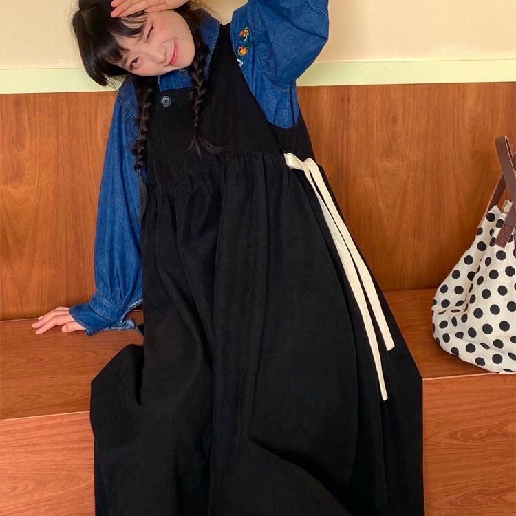 ワンピース オールインワン ジャンパースカート ロング ロング丈 袖なし スクエアネック フレア Aライン 切り替えデザイン プリーツ リボン サイドリボン ウエストマーク ボタン 厚手 コーデュロイ かわいい シンプル カジュアル おしゃれ お洒落 レトロ 大人可愛い こなれ感 マニッシュ ガーリー ルーズ 個性的 主役級 無地 秋 冬 10代 20代 30代 レディース 学生 通学 デート お出かけ 重ね着 ファッション コーデ 楽ちん S M ブラック ブラウン