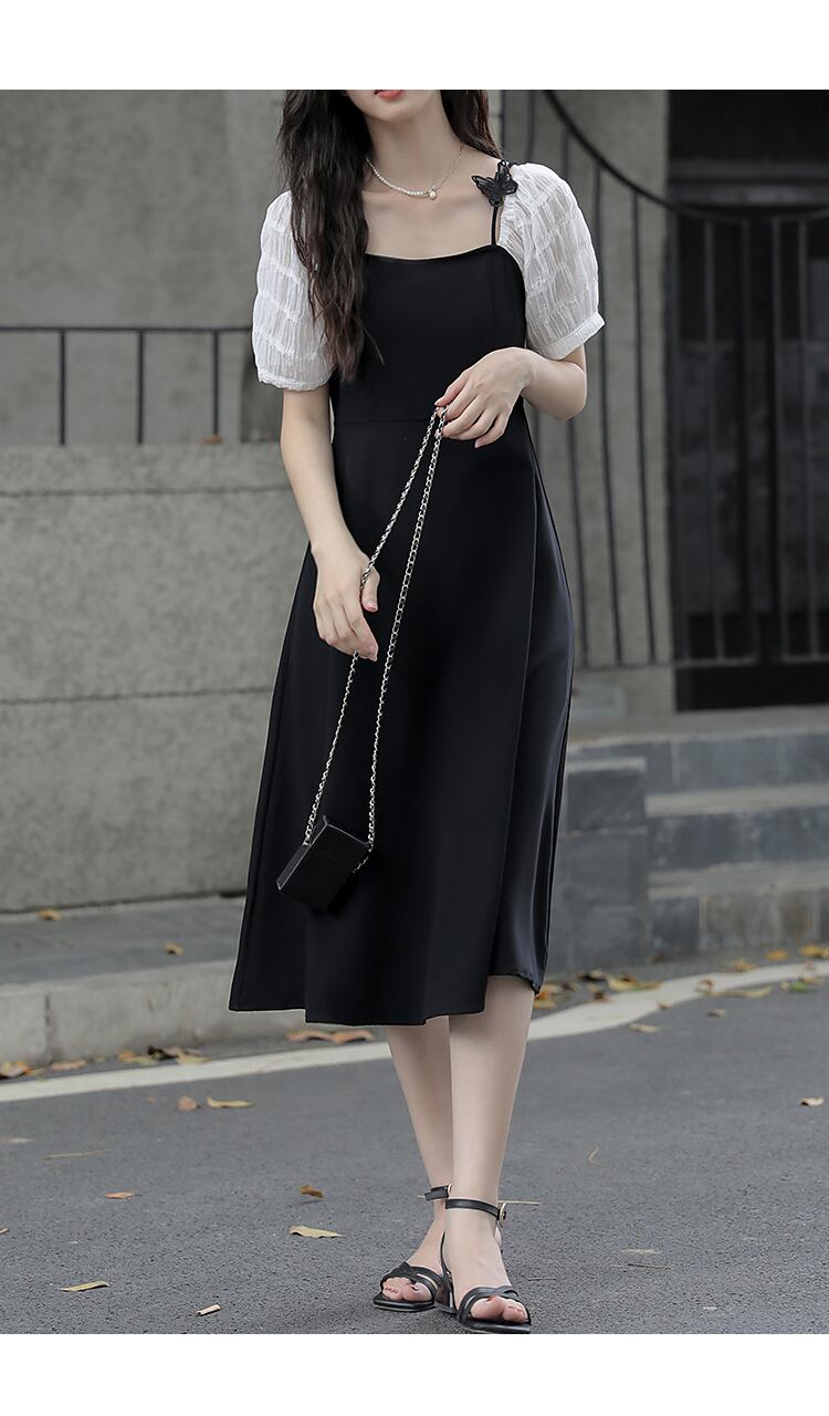 肩紐の蝶々がワンポイントのワンピドレスです。