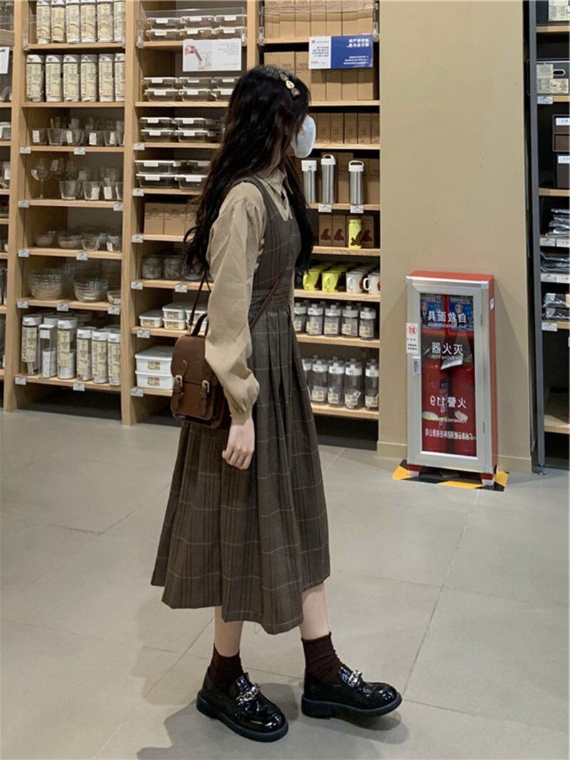 セットアップ シャツ ブラウス ジャンパースカート ジャンスカ ロング ロング丈 袖あり 長袖 ボリューム袖 襟付き フレア タイト Aライン プリーツ ウエストマーク ドッキング 前開き 2way 上下セット ツーピース シンプル カジュアル おしゃれ お洒落 レトロ こなれ感 マニッシュ キュート ガーリー エレガント モダン 存在感 無地 柄 チェック柄 グレンチェック 秋 冬 10代 20代 レディース お出かけ 休日 着回し 重ね着 モテ S M グレー ベージュ 秋カラー