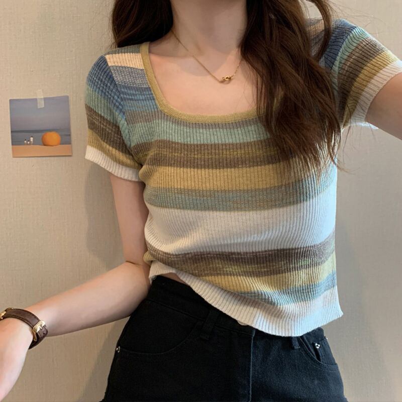 トップス ニットソー ショート ショート丈 袖あり 半袖 スクエアネック 襟なし スリム タイト 細身 リブ シック ニット 大人可愛い きれいめ カジュアル お洒落 かっこいい レトロ こなれ感 ラフ 個性的 柄 夏 20代 30代 レディース お出かけ 休日 普段使い スタイル インスタ映え S M L XL 緑 グリーン ライトグリーン ピンク ライトピンク