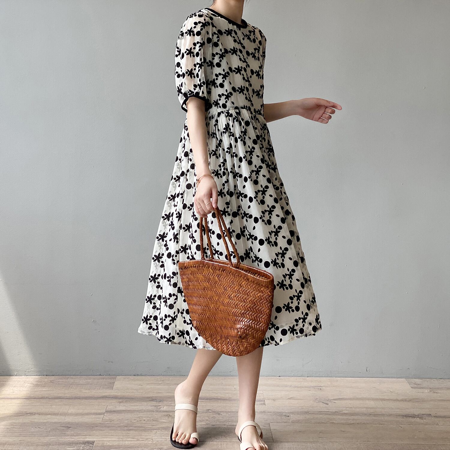 ワンピース フレアワンピース ワンピドレス ミモレ ミモレ丈 袖あり 半袖 ボリューム袖 パフスリーブ フレア Aライン シフォン ハイウエスト パイピング ボタン 上品 お洒落 大人可愛い 大人女子 こなれ感 ガーリー ルーズ エレガント とろみ感 抜け感 柄 花柄 フラワー ドット柄 夏 40代 お出かけ 旅行 楽ちん モテ 体系カバー S M L ゆったり ゆる 白 ホワイト モノトーン