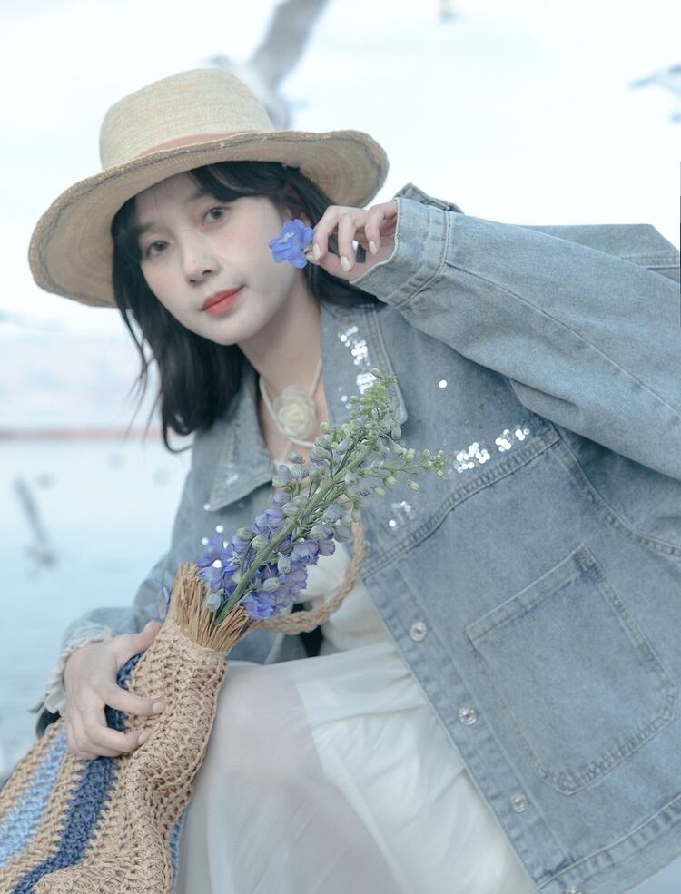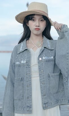 アウター ブルゾン ジャケット シャンパー Gジャン 上着 袖あり 長袖 襟付き ワイド 前開き デニム ブルーデニム ヴィンテージデニム スパンコール キラキラ かわいい カジュアル おしゃれ お洒落 かっこいい こなれ感 ラフ ルーズ 大人可愛い 個性的 主役級 存在感 春 秋 10代 20代 30代 レディース デート お出かけ 休日 旅行 着回し 重ね着 韓国系 オルチャン ファッション S M L